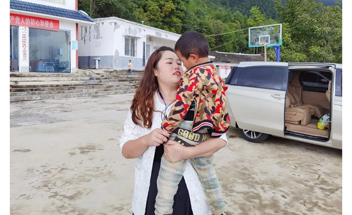 志愿者抱着小向远,正细心的帮他修剪指甲时,了解到小向远的妈妈在外打工,志愿者就问要不要给妈妈打个电话,小向远羞涩的点点头。志愿者通过校长拨通了张向远妈妈的电话,孩子期待着等待着电话那头的声音。电话接通了,小向远大声的呼喊着妈妈。